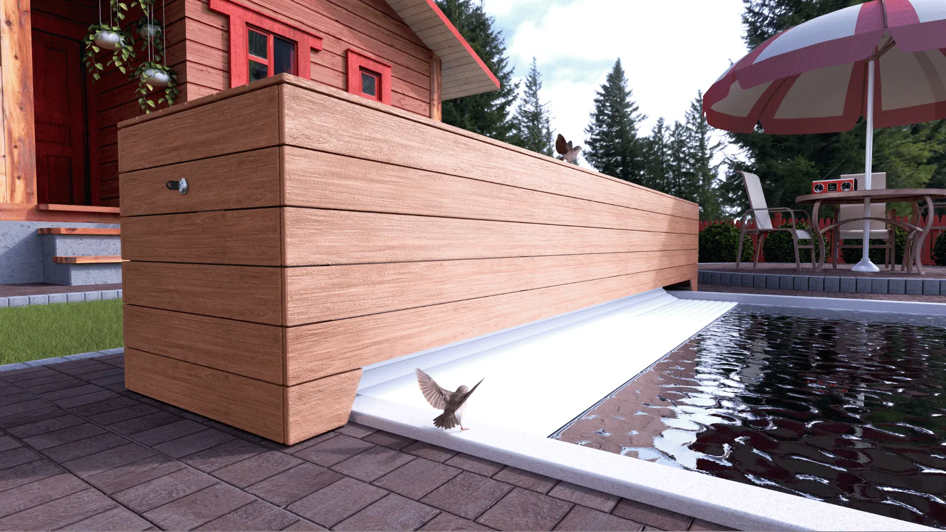 Model Box - arbore aluminiu, dimensiune piscina diverse posibile, actioanre la cheie sau cu telecomanda , sistem click de montaj a finisajului pe cutie, finisaj la alegere dvs (IPE sau profile aluminiu vopsite). Culori RAL posibile: RAL 9016, RAL7035, RAL7037, RAL 7016, RAL9006)